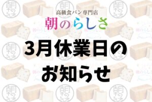 いつも「朝のらしさ」をご愛顧頂き、誠にありがとうございます。 3月は以下の日が休業日となりますので、よろしくお願い致し…