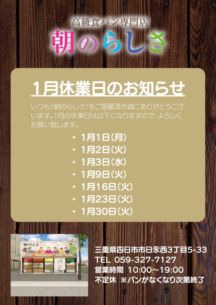 1月は以下の日が休業日となりますので、よろしくお願い致します。