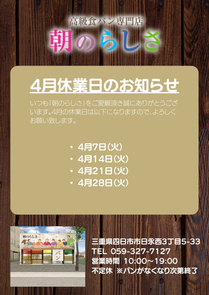 4月は以下の日が休業日となりますので、よろしくお願い致します。